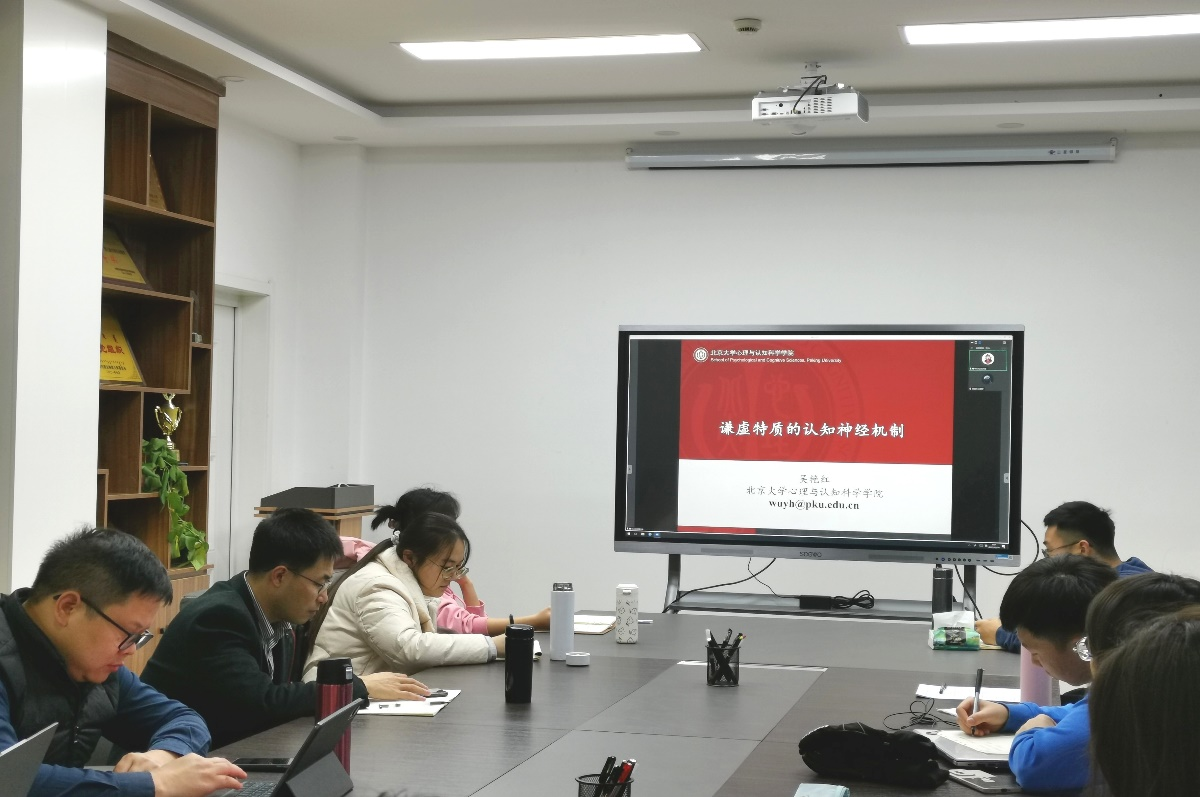 12月14日,邀请全国应用心理专业学位研究生教育指导委员会主任、教育部基础教育心理健康教育指导专委会副主任委员、中国心理学会神经心理学专业委员会主任、北京大学心理与认知科学学院吴艳红教授在线上作题为《谦虚特质的认知神经机制》的学术报告,吴艳红教授从哲学层面的自我层层剖析,深入浅出的引出中国人谦虚特质的含义和内容,并通过质性研究、行为研究、脑电研究及核磁研究,初步揭示了中国人谦虚特质的认知神经机制,并指明了下一步的研究方向。