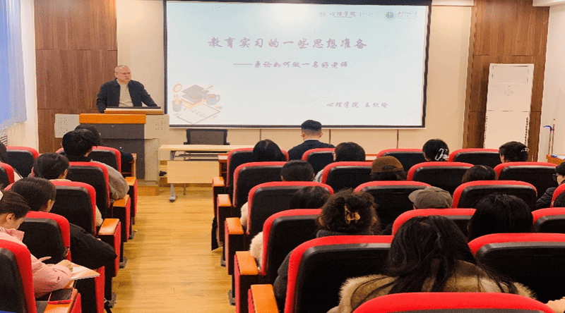 随后,王欣瑜老师围绕“教育实习的思想准备—兼论如何做一名好老师”主题,为实习生带来专题讲座。讲座以先秦“教育”与“心育”二字的篆体解构为引,深刻阐释教育本义与心理健康教育的职业内核。他从三个维度对实习生寄予厚望:一要潜心体悟教育的内在智慧;二要将教育事业内化为终身人生信仰;三要以教育实习为基石,筑牢为师之道的根基。现场实习同学专注学习、详实记录,学习氛围浓厚热烈。