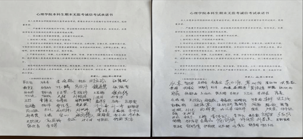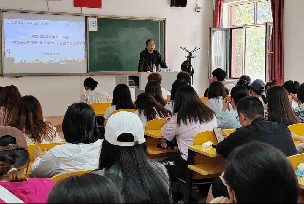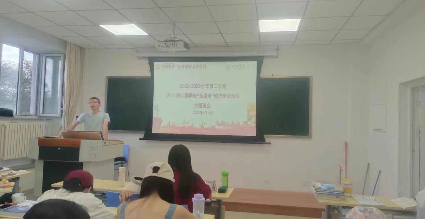 在主题教育推进之际,为进一步加强学院学风建设,做好学生诚信考试教育,确保本学期期末考试顺利进行,近日,jinnianhui今年会2021级、2022级心理学班分别召开2022-2023学年第二学期“无监考”诚信考试教育主题班会。主题班会分别由班主任董洪杰、梁宏宇主持。