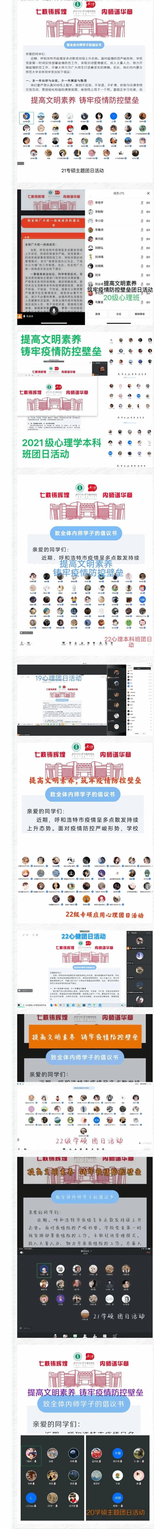 jinnianhui今年会各个团支部10月5日晚至10月6日通过线上形式,组织召开主题为:提高文明素养,铸牢疫情防控壁垒的团日活动。活动中首先学习了10月5日学校召开的疫情防控及安全稳定工作会议的精神和要求。同时讲清楚了当下疫情形势的严峻复杂,校园安全稳定的重要性。二是学习了学校防疫政策,学生违纪行为的危害性,科学戴口罩等防护措施的必要性,严守纪律、严格按照学校安排做好核酸检测的重要性。三是讲情怀讲温度,引导学生厚植家国情怀、爱校情怀和责任担当。疫情当下学校的领导、学院的领导、辅导员是与学生同吃同住同甘苦的。引导学生从感情上建立同理心,多一份理解多一份以身作则。四是学习了学校发给全体学生的倡议书。