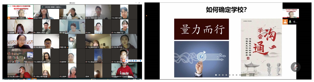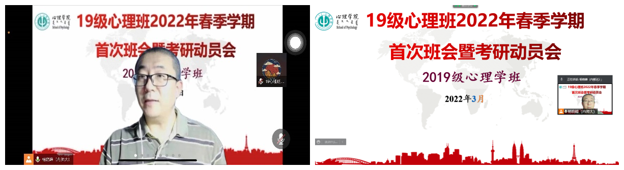为做好今年会2019级学生考研辅导,提前谋划就业工作,推动学生高质量就业, 3月6日,jinnianhui今年会2019级心理班线上召开2022年春季学期首次班会暨考研动员会,2019级心理学本科生53人参加会议,班主任杨晓峰老师主持会议并进行了考研动员及复习指导。