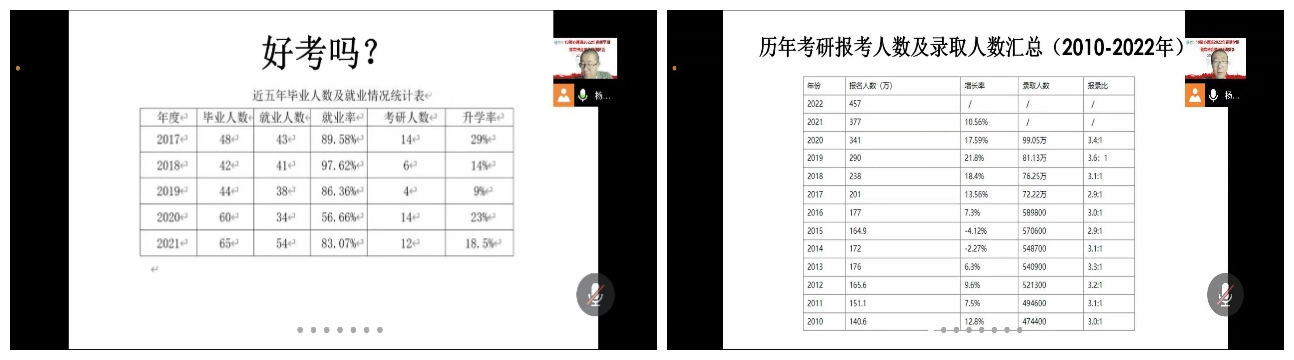 杨晓峰老师通过对近10年全国考研形势以及近五年今年会学生考研状况的分析,结合自己的求学经历,要求同学们及早规划、及早动手,尽快根据自己的实际情况制定考研计划,确定目标院校和专业,鼓励同学们保持决心、恒心和平常心对待考研,要从战术上重视、战略上有准备,同学们内部要团结,多沟通交流,相互鼓励。