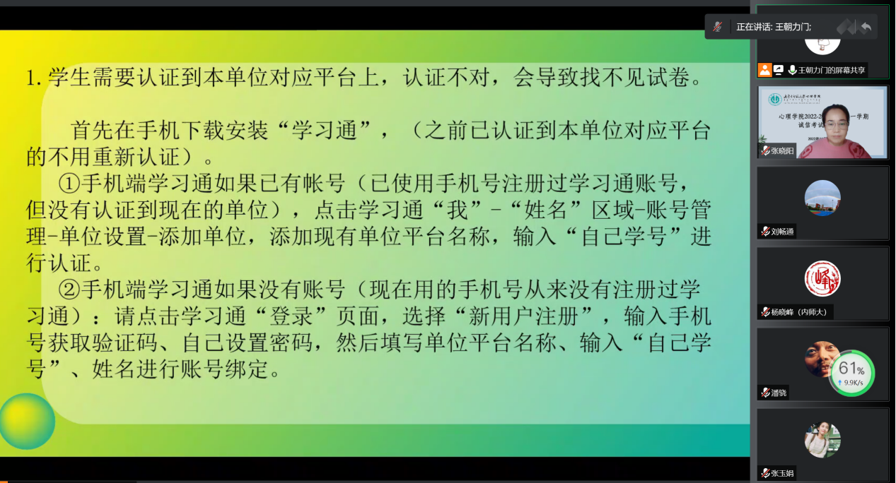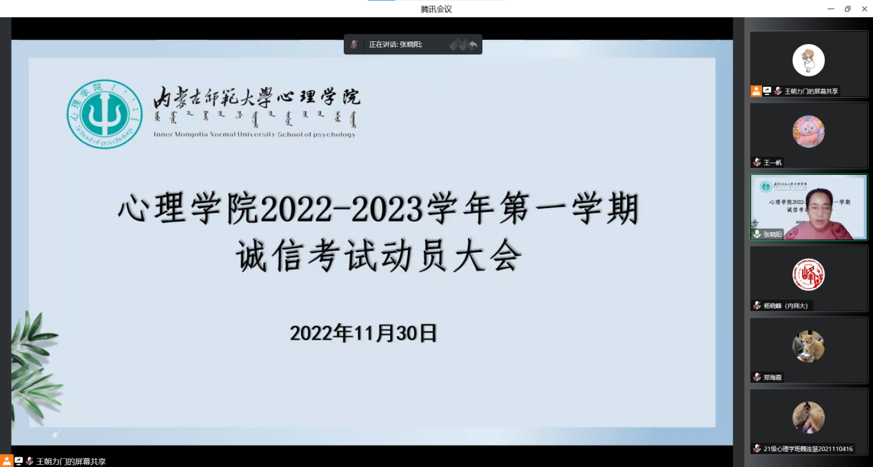 为进一步推进学风建设,加强诚信考试教育,确保本学期期末线上考试顺利进行,jinnianhui今年会11月30日召开2022-2023学年第一学期诚信考试动员大会。学院党委副书记、副院长张晓阳,心理学系主任杨晓峰,教务办王朝力门及2021级、2022级全体本科生参加会议,会议由学院党委副书记、副院长张晓阳主持。