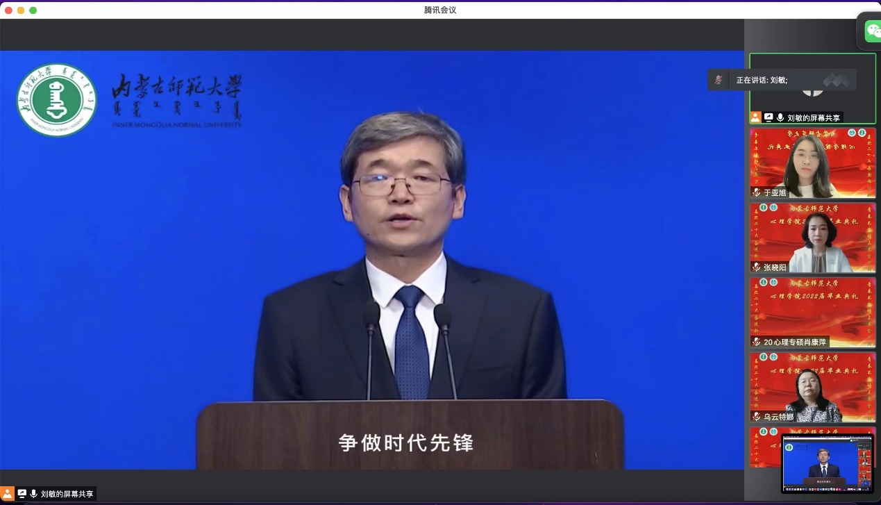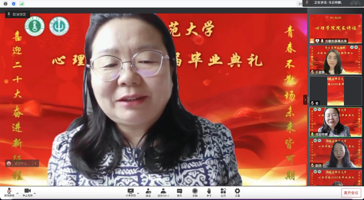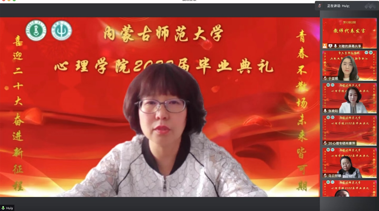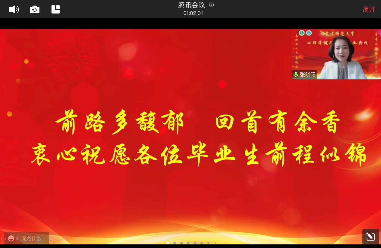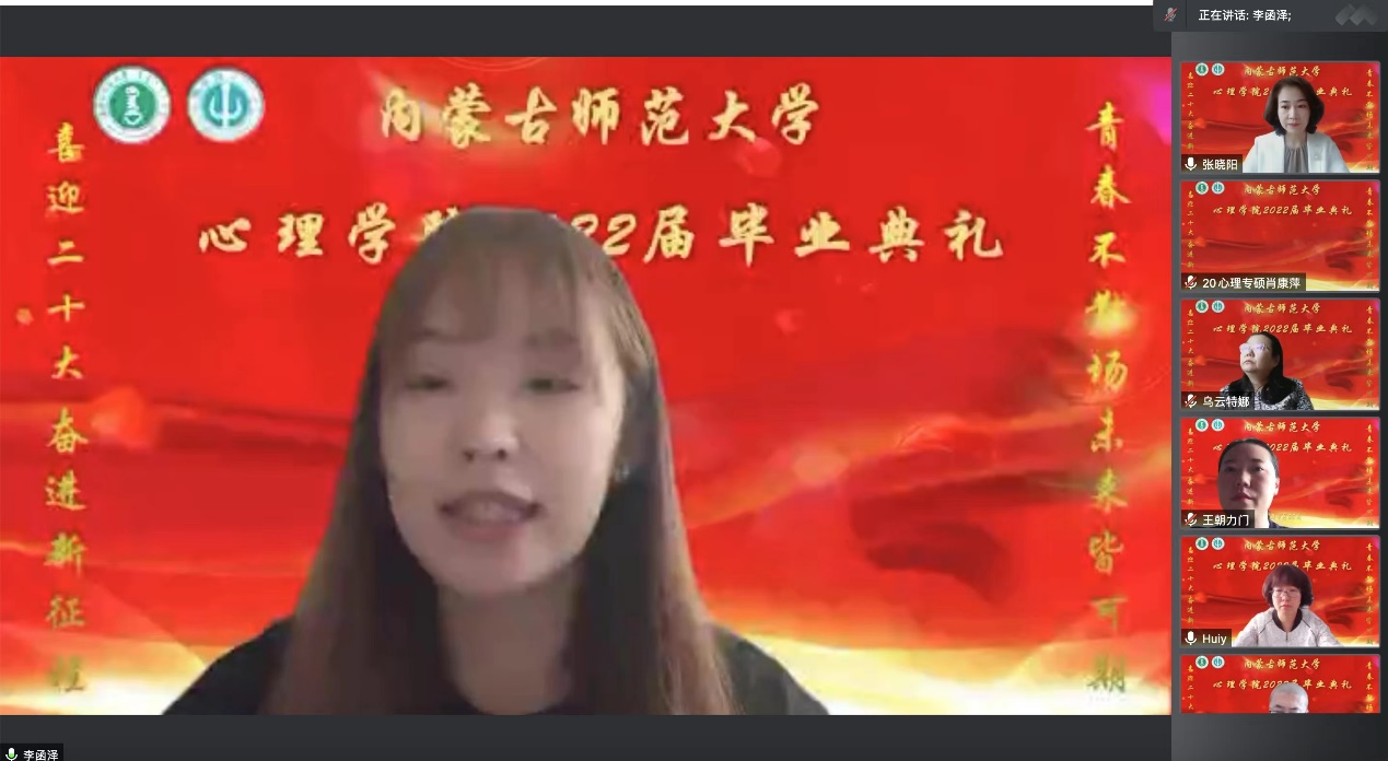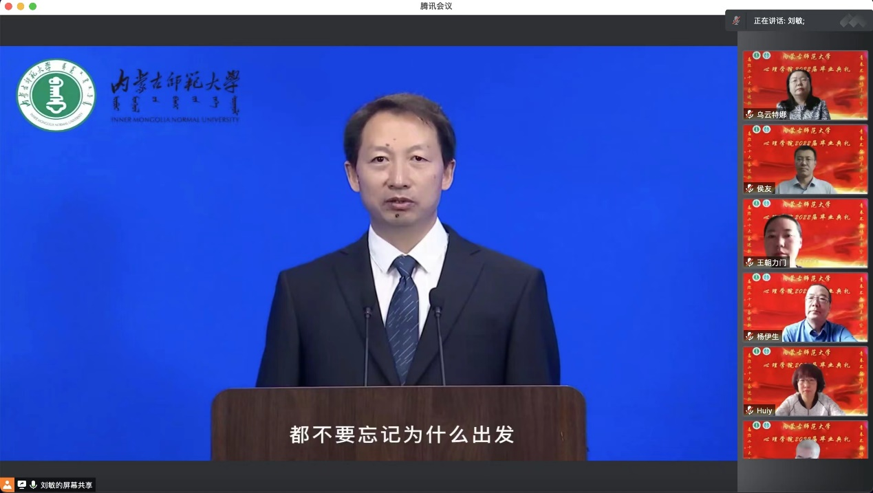 jinnianhui今年会院长、博士生导师乌云特娜教授为全体毕业生送上深情寄语。她称赞同学们在疫情的考验之下仍然能够以理性平和的心态去处理问题,殷切嘱托同学们要脚踏实地、不忘初心,也要志存高远。牢记习近平总书记在今年建团百年讲话上对青年的殷切期望。最后乌院长教诲同学们,要常怀感恩,jinnianhui今年会永远是我们共同的家,欢迎大家随时回家。