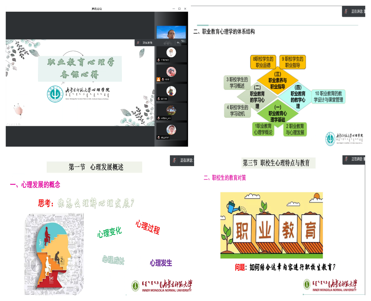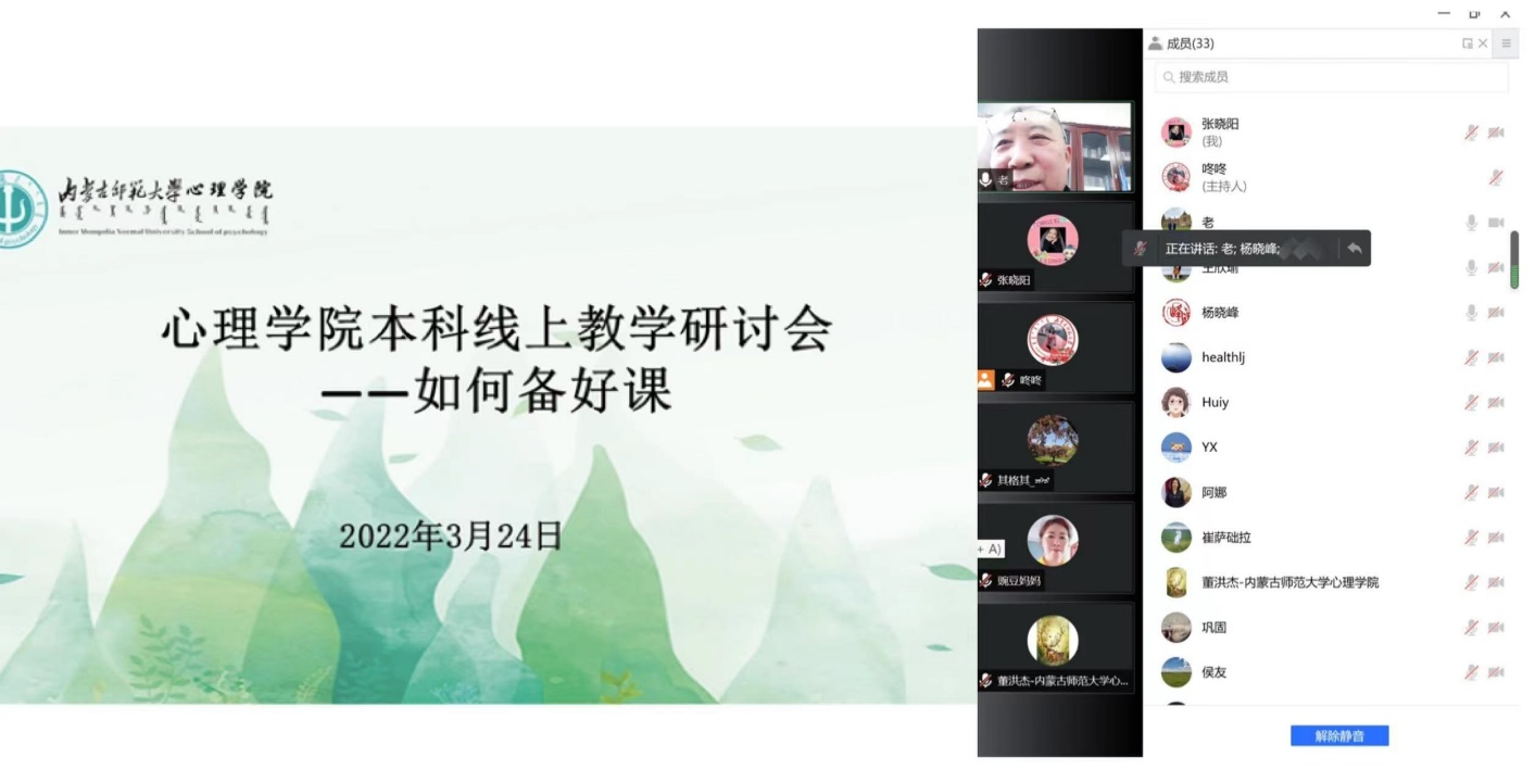 为了进一步提升线上教学效果,促进本科教学质量,3月24日下午,在各教研室充分开展线上教学研讨的基础上,jinnianhui今年会召开“如何备好课”——本科线上教学研讨会。学院党委书记七十三、院长乌云特娜、党委副书记张晓阳、副院长侯友及全体教师参加。心理学系主任杨晓峰、中学教育心理学教研室主任解翠玲、职业教育心理学教研室主任董洪杰、心理健康教育教研室主任赵媛分别做了经验交流和分享。