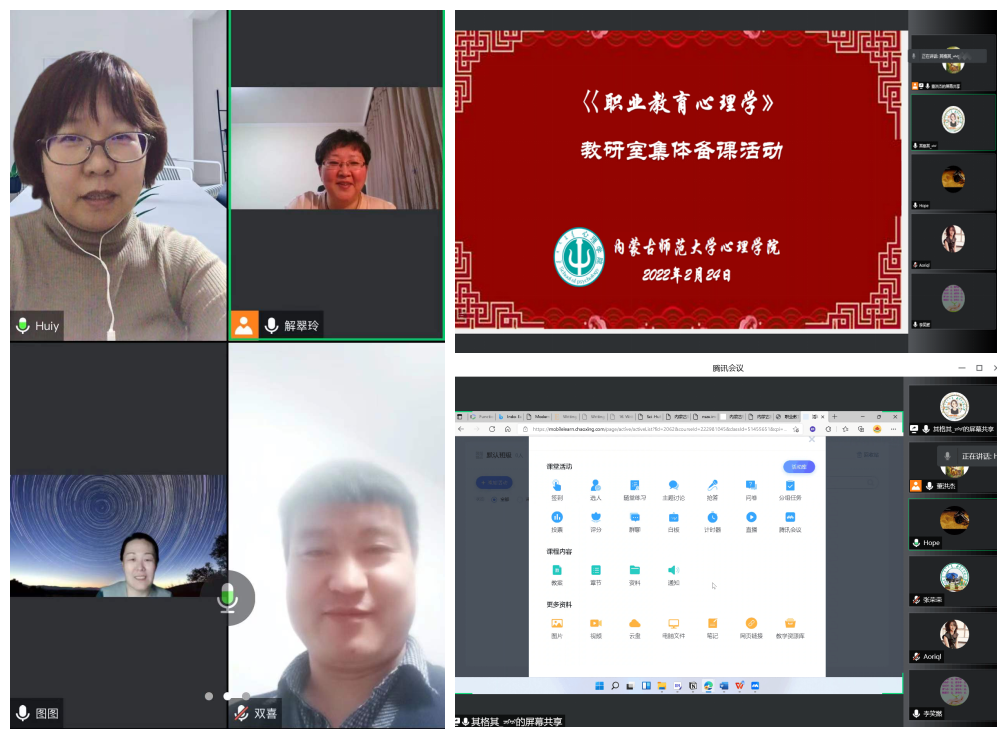 为适应新冠肺炎防控形势下的线上教学,jinnianhui今年会各公共课教研室分别于2月22日与2月24日组织开展了《中学教育心理学》《职业教育心理学》线上集体备课活动,本学期授课教师均在线参加。