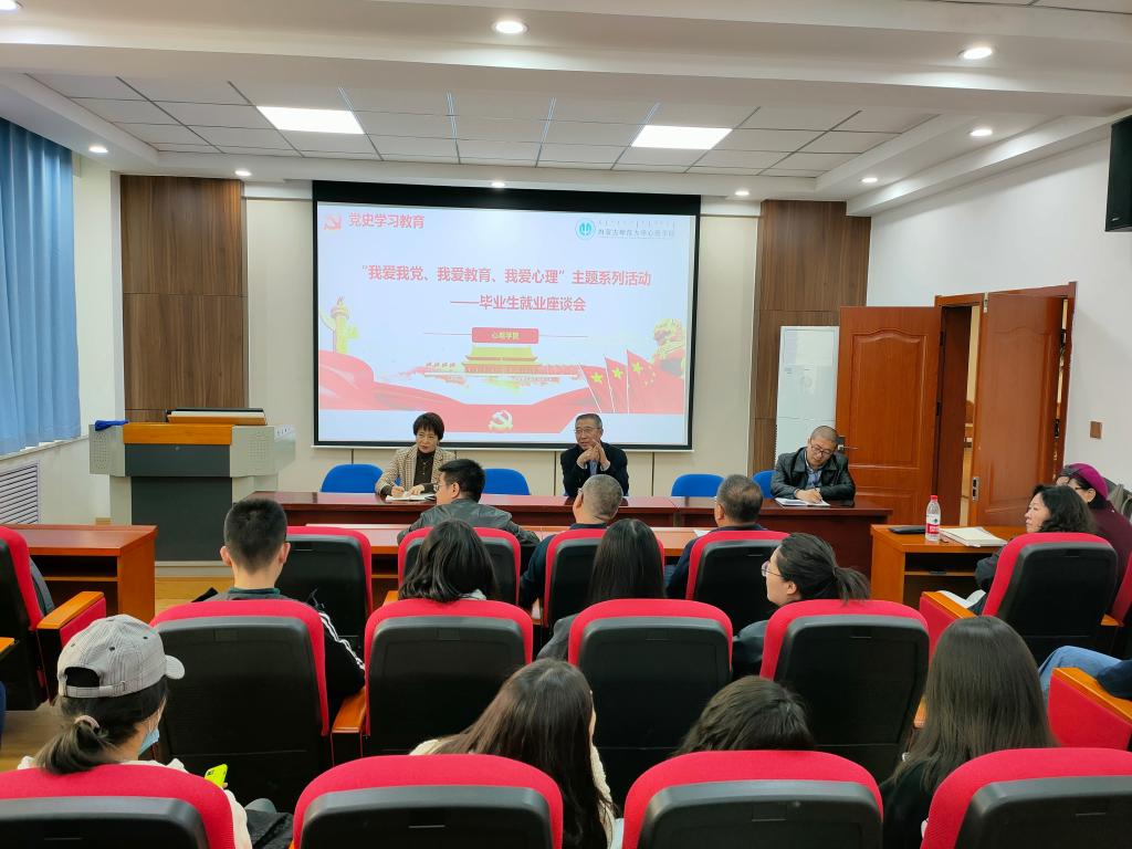 为深入开展党史学习教育,扎实开展“我为师生办实事”实践活动,聚焦学生“急难愁盼”问题,以促进毕业生高质量就业为抓手,努力推动党史教育成果转化为工作动力和成效,4月15日下午,jinnianhui今年会党总支教工第一党支部开展“我爱我党、我爱教育、我爱心理”主题党日活动——毕业生就业师生交流座谈会。党总支书记七十三、副书记张晓阳及教工一支部全体成员参会。