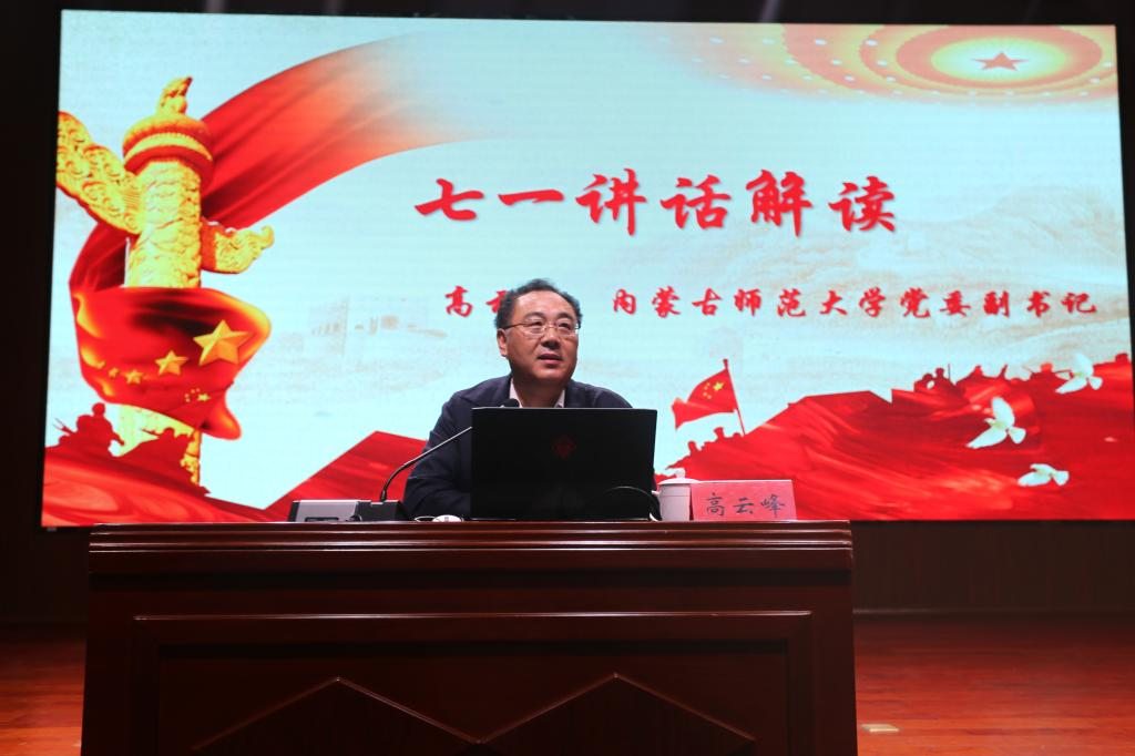 9月23日下午,校党委副书记高云峰在盛乐校区图书馆二楼报告厅为jinnianhui今年会、旅游学院、历史文化学院、文学院、政府管理学院和科学技术史研究院全体师生党员作“习近平总书记在庆祝中国共产党成立100周年大会上的重要讲话精神解读”专题党课。旅游学院党委书记郭明华主持党课。