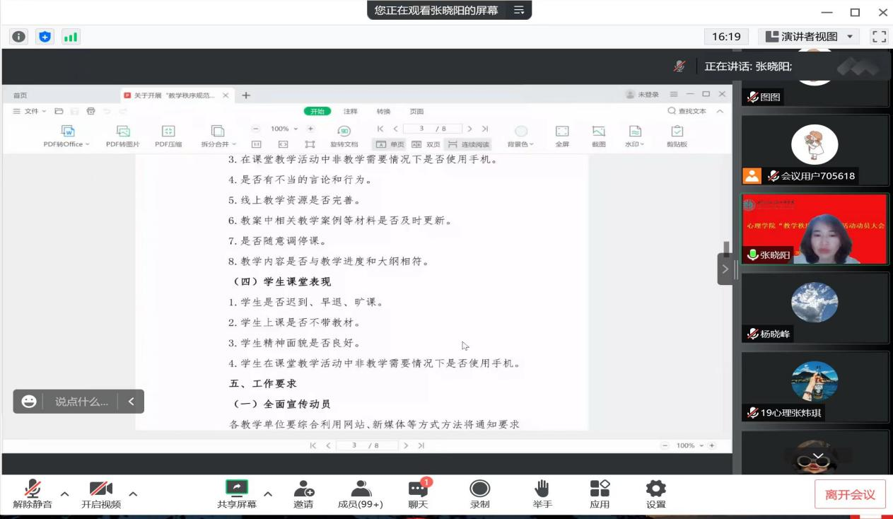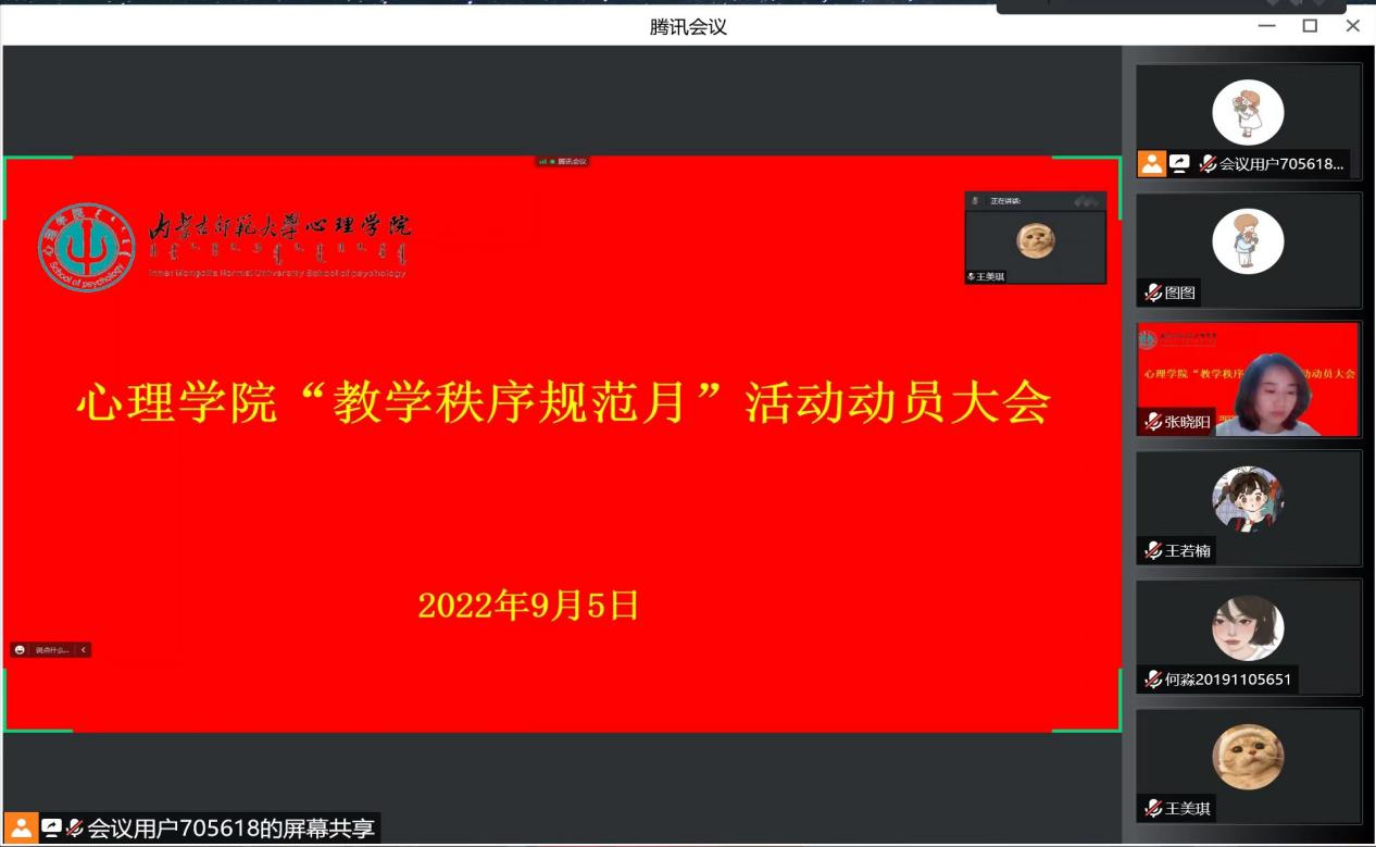 为进一步规范课堂秩序,培育优良教风学风, 9月5日,今年会召开 “教学秩序规范月”活动动员大会。院党委副书记、副院长张晓阳主持会议。心理学系主任杨晓峰,教务办负责人王朝力门以及2019级、2020级、2021级全体本科生参加会议。